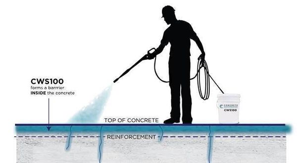 A: CWS100® Concrete protection & Waterproofing system is a modified sodium silicate that penetrates concrete and reacts with free calcium to form a gel that seals pores and cracks from within. It becomes an integral part of the structure. This results in a lifetime of waterproofing which does not require frequent replacements.